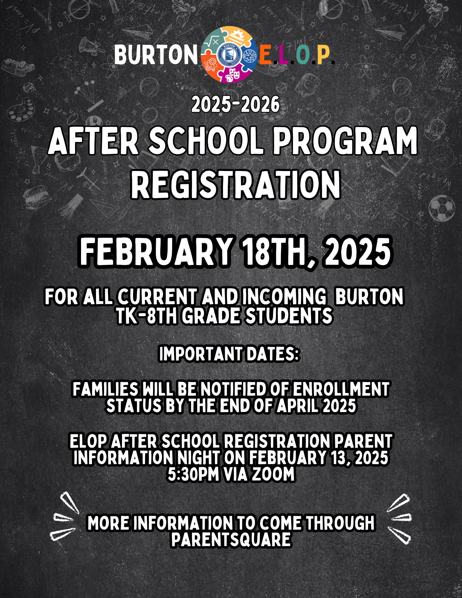 We will be opening up ELOP after school registration on February 18th, 2025 at 9am. This year we will be doing online enrollment through a software that connects to our Student Information System, Aeries. Registration will be for ALL current and incoming Burton students. We will also be holding a parent information night on February 13th at 5:30pm via zoom. Please keep an eye on your ParentSquare and our social media channels for more information.